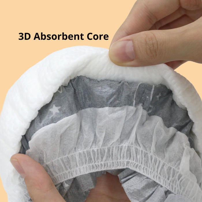 The breathable, soft, and highly absorbent materials ensure the baby's comfort, and the pH-sensitive wetness indicator, leg cuffs, and fastening system offer convenience. Made with a super absorbent 3D core, unique deep pocket, and high back waistband for up to 12-hour leak protection.