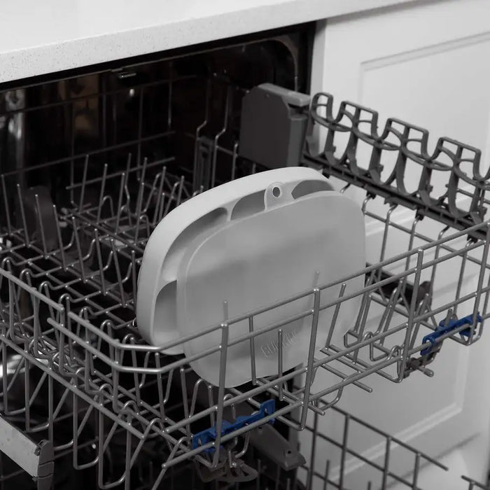 The 5 Section Grip Dish can be safely put in the microwave, oven (up to 200°C), freezer, or dishwasher. A strong suction base, keeps the Grip Dish in place, making plates on the floor a thing of the past!