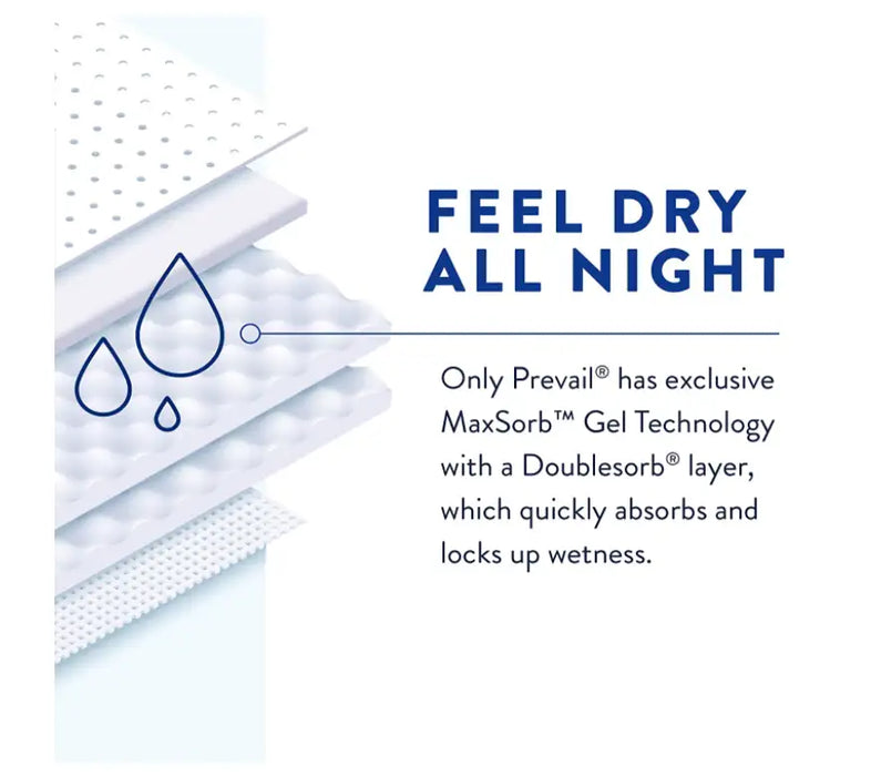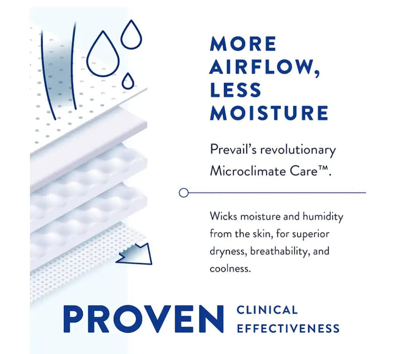 Prevail Air™ Overnight Briefs offer extended use protection, comfort and breathability for those dealing with heavy bladder or bowel leakage. The Prevail Microclimate Care™ system creates a favorable microclimate by incorporating performance features to help maintain normal skin temperature and moisture at the skin surface, which supports healthy skin. Microclimate Care™ features include: MaxSorb™ Gel Technology which locks up wetness to help you feel cleaner, fresher, and drier; 100% breathable moisture barrier that allows the skin to breathe; Dri-Fit™ system to help keep skin dry and healthy by reducing friction; Omni-Odor Guard™ helps neutralizes odors before they start; Skin Smart® Fabric helps protect skin with vitamin E, Aloe, and chamomile; Expandex™ Wings for a more contoured fit, Easy-Lock Fastener® that grip and hold without being sticky, Cloth-Like Outer Fabric is soft and comfortable, and Direct-Lock™ Panels offer an adjustable fit.