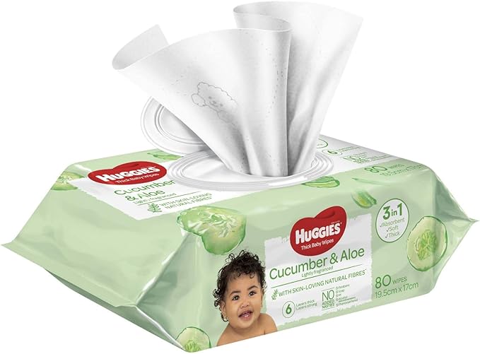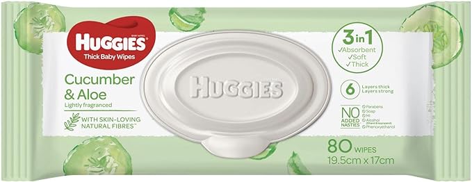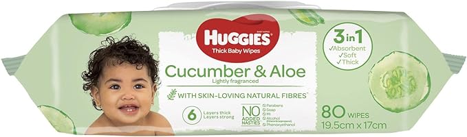 Huggies Thick & Soft Baby Wipes Cucumber & Aloe are cotton-like and gentle on the skin. Lightly fragranced, thick, soft and absorbent with triple clean function.