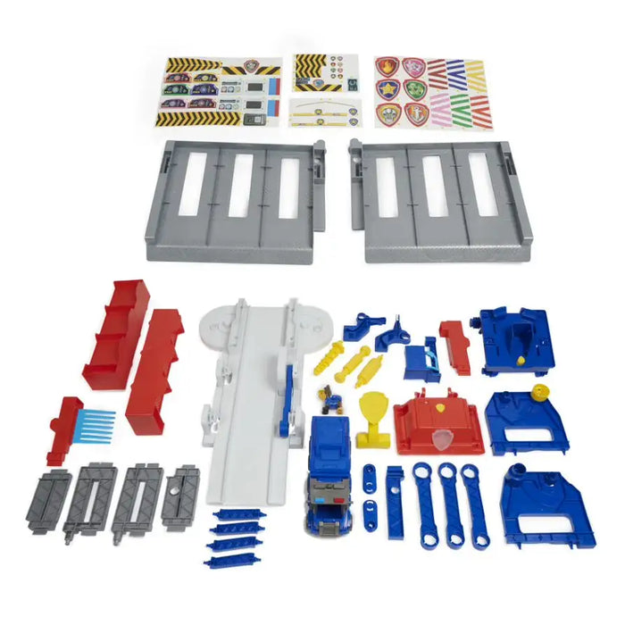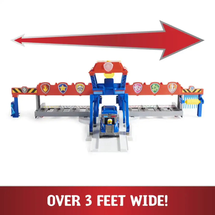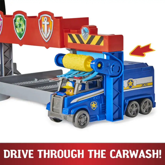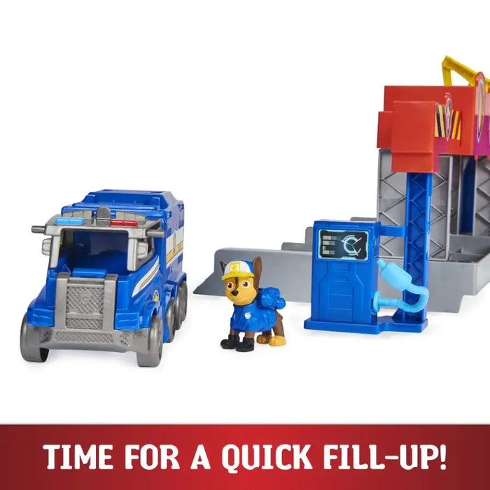 The Big Rig Pups are ready for another super charged adventure in their PAW Patrol Big Truck Pups -Truck Stop HQ playset! Featuring exciting lights and sounds from the show, the Truck Stop HQ features an exciting transformation, extending over 3' Feet Wide, to create enough room for Chase and the rest of the pups, in their Big Rig trucks! (sold separately) When Chase arrivesat the HQ, place him into the control room then raise it up, to expand the HQ and transforminto rescue mode! Then, once in rescue mode, hop in the truck and stop by the tune-up station to get a fill-up, before taking a trip through the HQ carwash. When your toy truck is ready for action, load it into the center bay and use the Big Rig launcher to blast off on your next heroic mission!